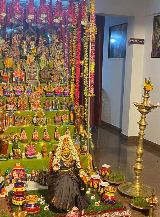 Community Sharing: Families and temple devotees visit each other’s Golu displays, exchanging gifts, singing devotional songs, and sharing Sundal (a variety of sweet or savoury lentil and pulse preparations).